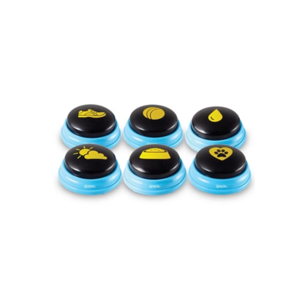 You'll learn to teach your dog six essential words and phrases: “Outside!,” “Play!,” “Eat!,” “Water!,” “Walk!,” and ”Love You!” Whether you're starting your dog’s communication journey or enhancing existing training, these buttons are perfect for integrating into pet speech setups or obedience games.