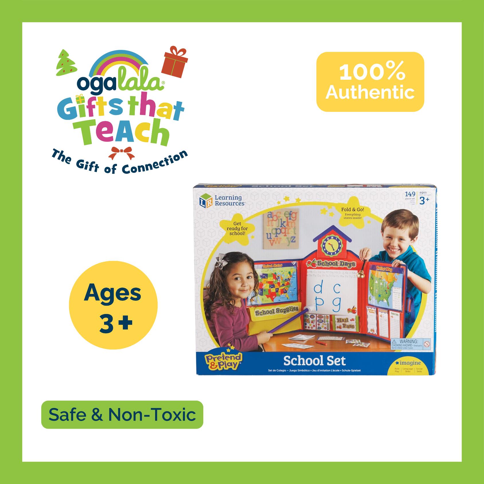 The Pretend and Play School Set not only supports imaginative play, social interaction, and problem solving, but encourages school readiness for young students
