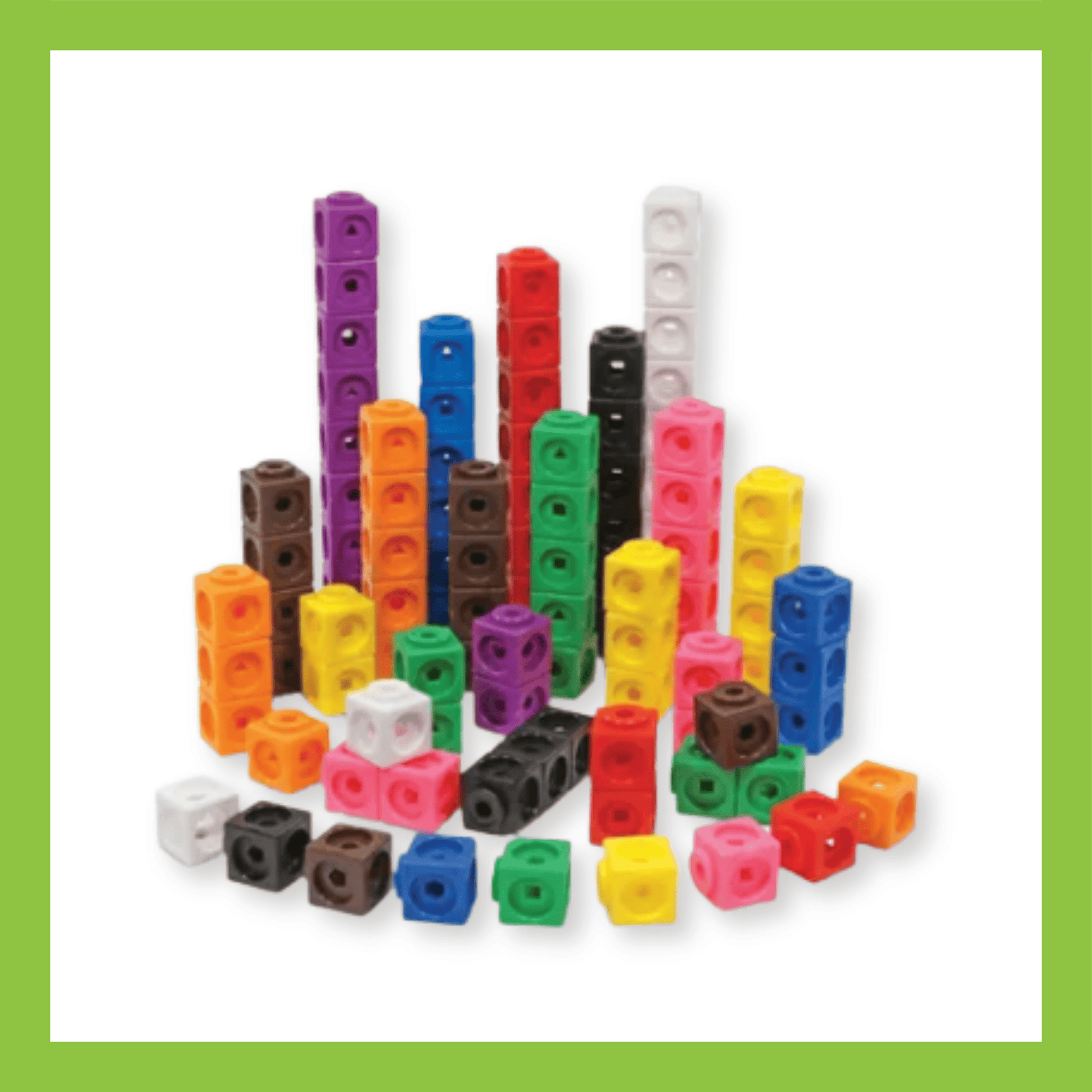 SKILL DEVELOPMENT: The use of MathLink® Cubes for skill development is wide-reaching, covering one-to-one correspondence, counting up to 100, skip counting, comparison, making 10, nonstandardized measurements, grouping, addition, subtraction and graphing; moreover, it facilitates color identification, shape recognition, patterning, matching, plus the improvement of fine motor, eye-hand coordination and motor planning abilities.