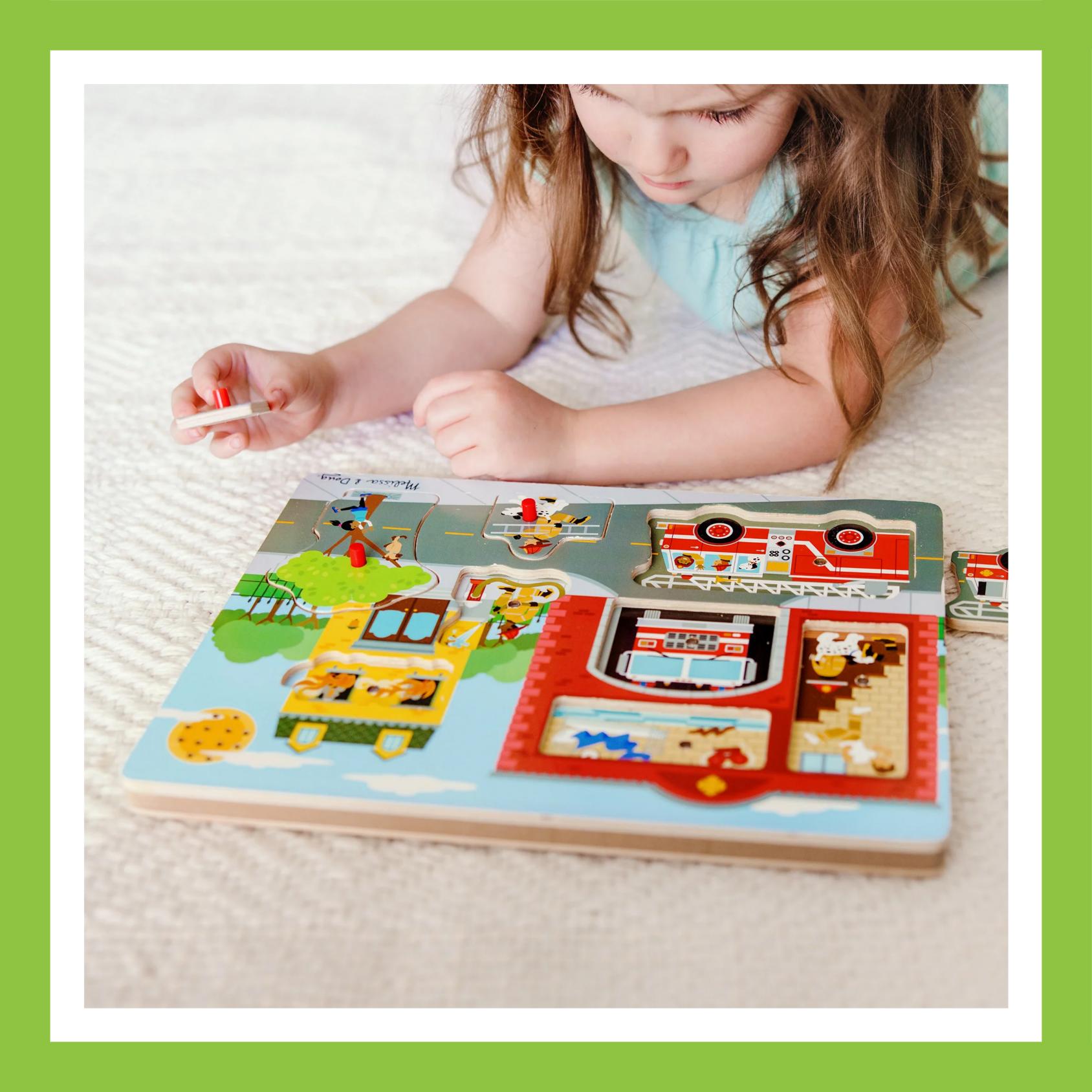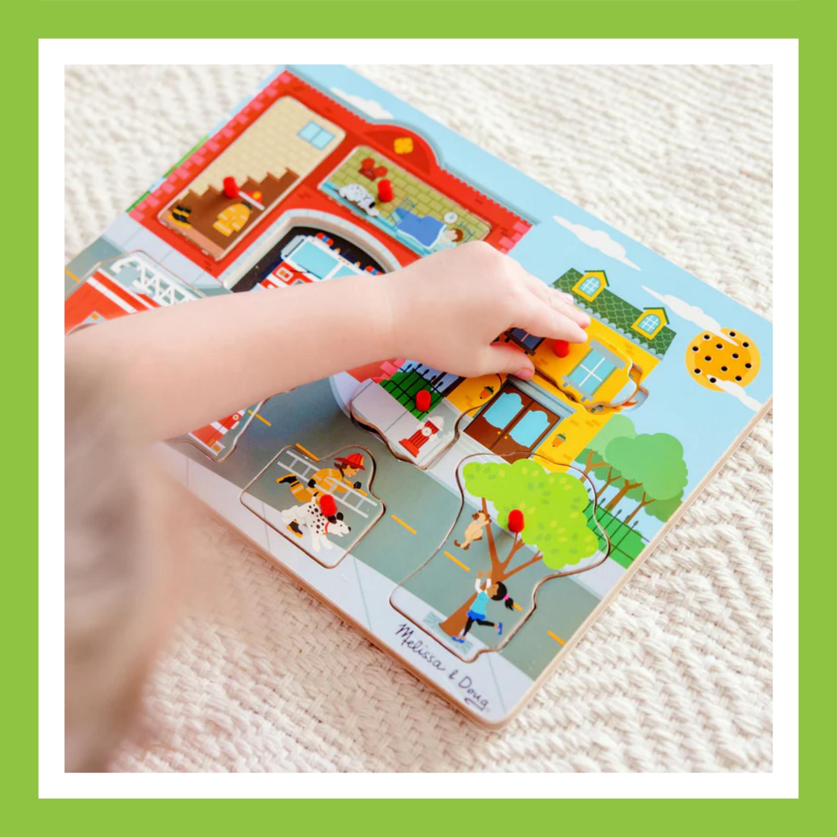 This unique sound puzzle lets kids two and older discover a fire alarm waking up a sleeping firefighter, a fire crackling in an apartment, a cat being rescued from a tree, and much more. Replace the piece to immediately stop the sound and move to the next scene!