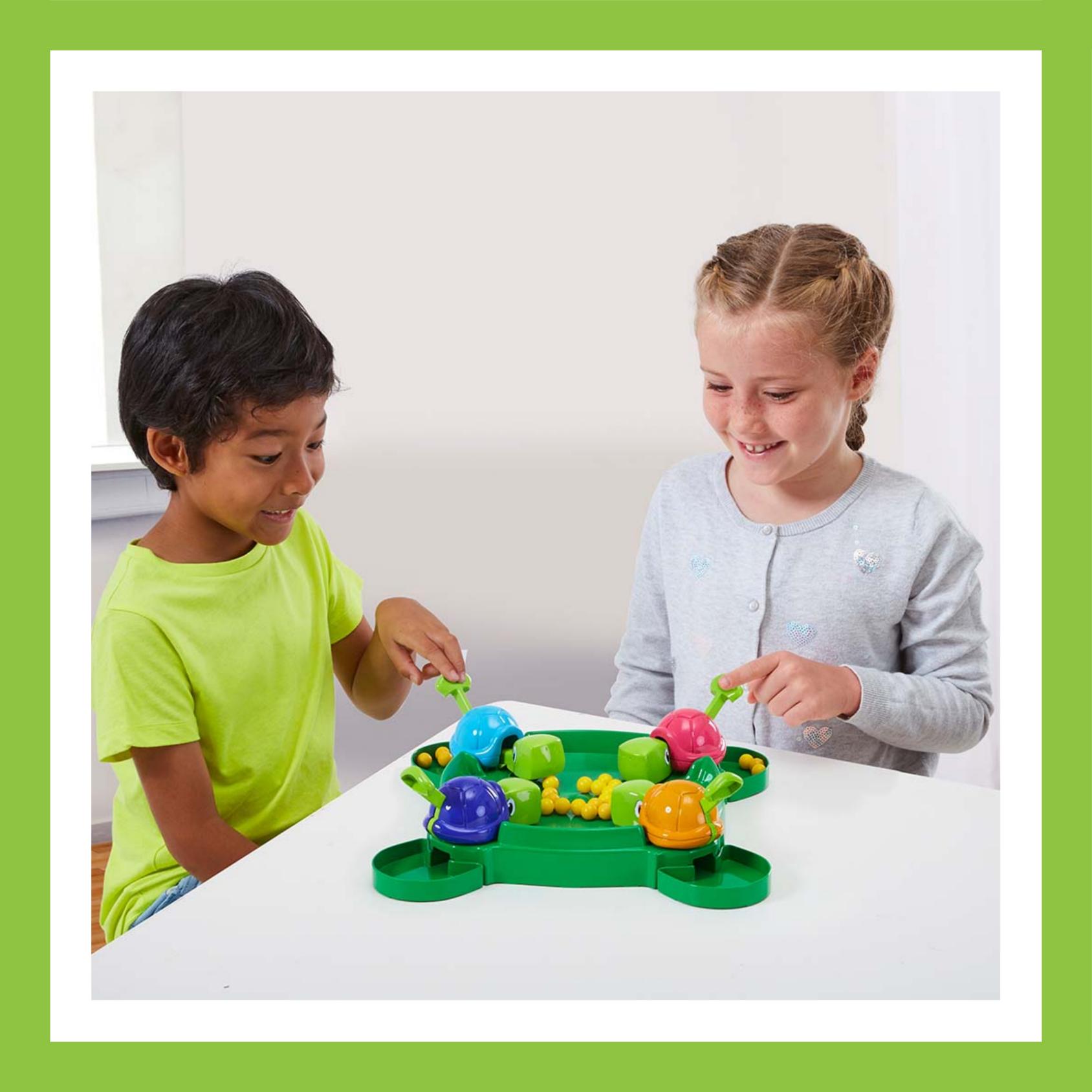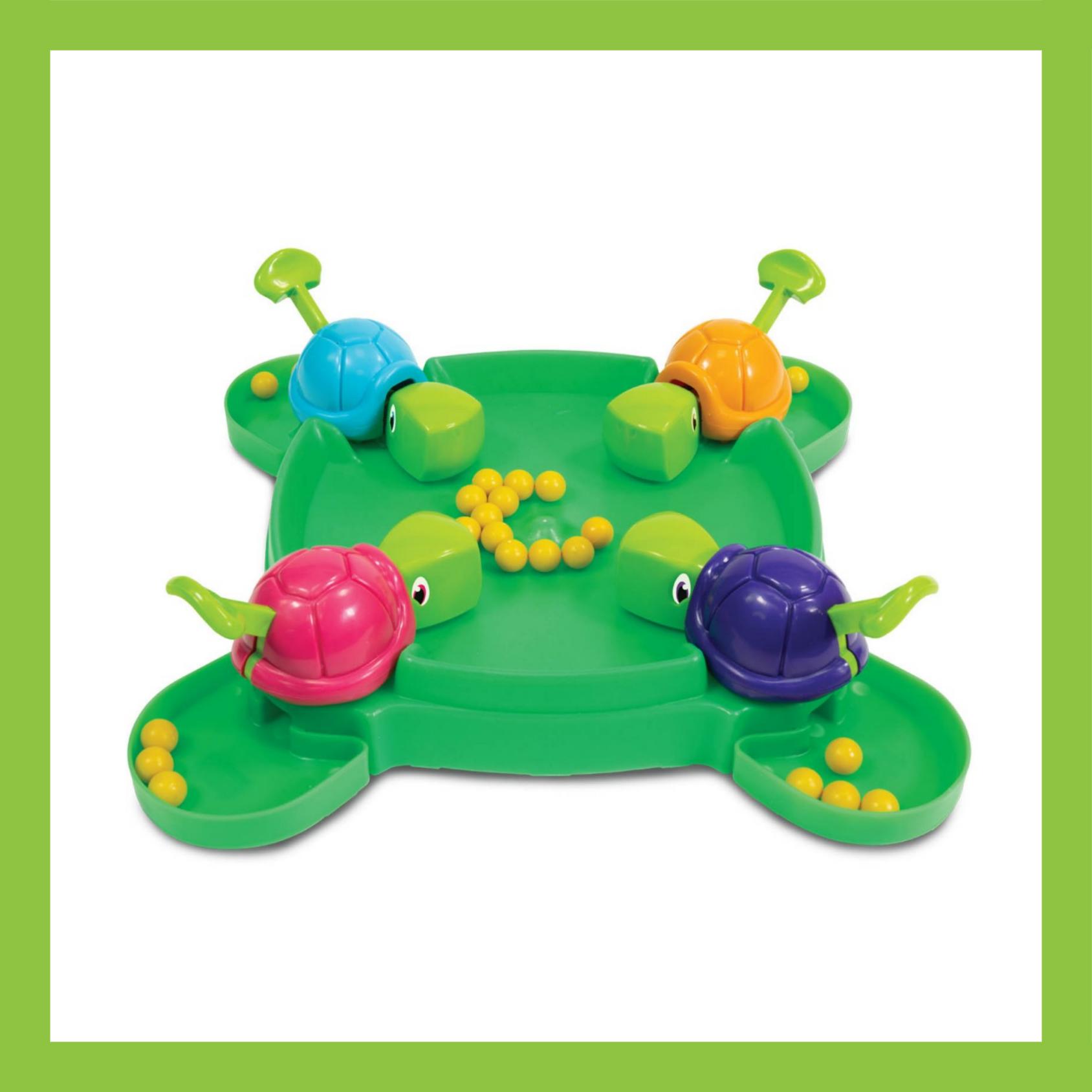 Includes a vibrant game base with four colorful turtles, four trays, and 24 yellow marbles.