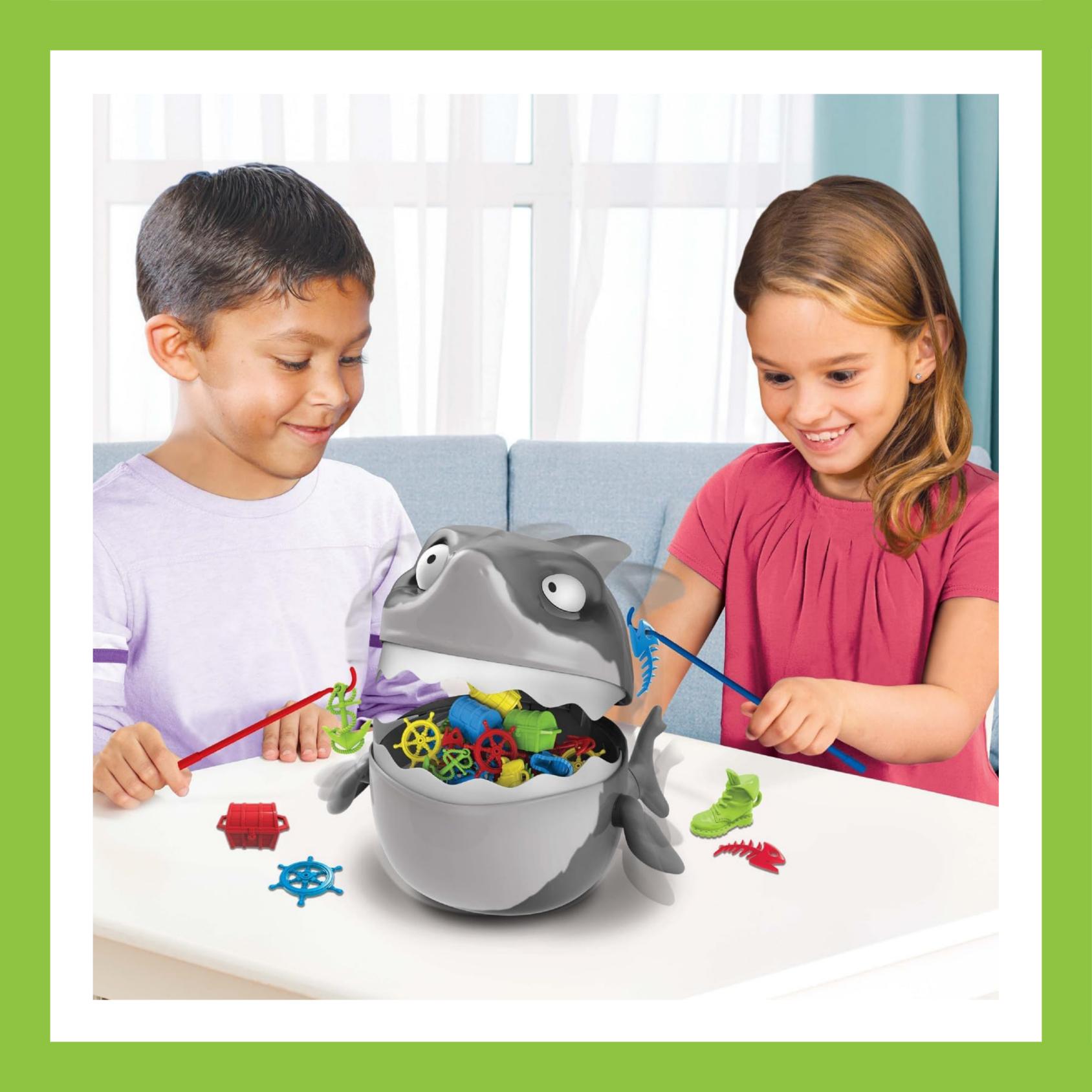 INCLUDES: 1 Wobbling Shark game base unit, 20 Sea-themed playing pieces, 4 Fishing gaffs, Instructions