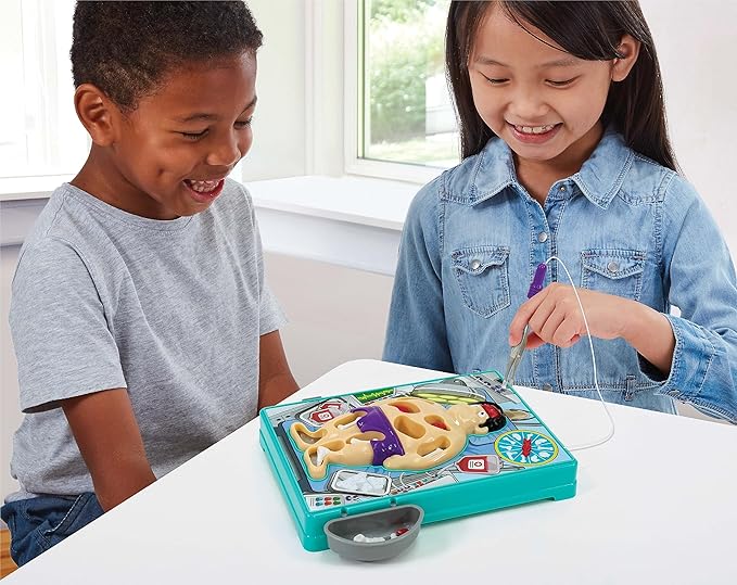 INCLUDES: Operating Table, Anatomy Parts, Collection Tray, Tweezers, Spinner Arrow and Pin, Instructions