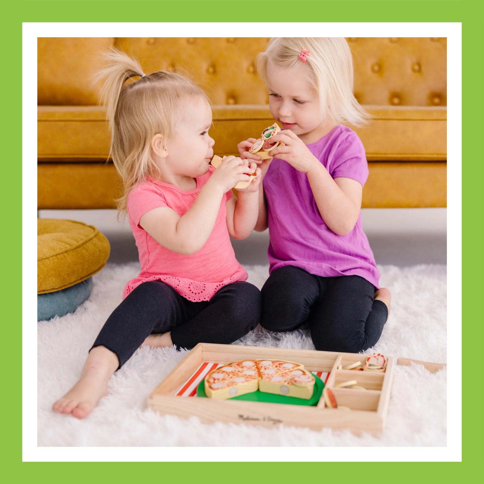 The set comes with a brightly colored tray, pizza cutter, spatula, and a wooden box for storage, and the pizza makes "slicing" noises when cut!