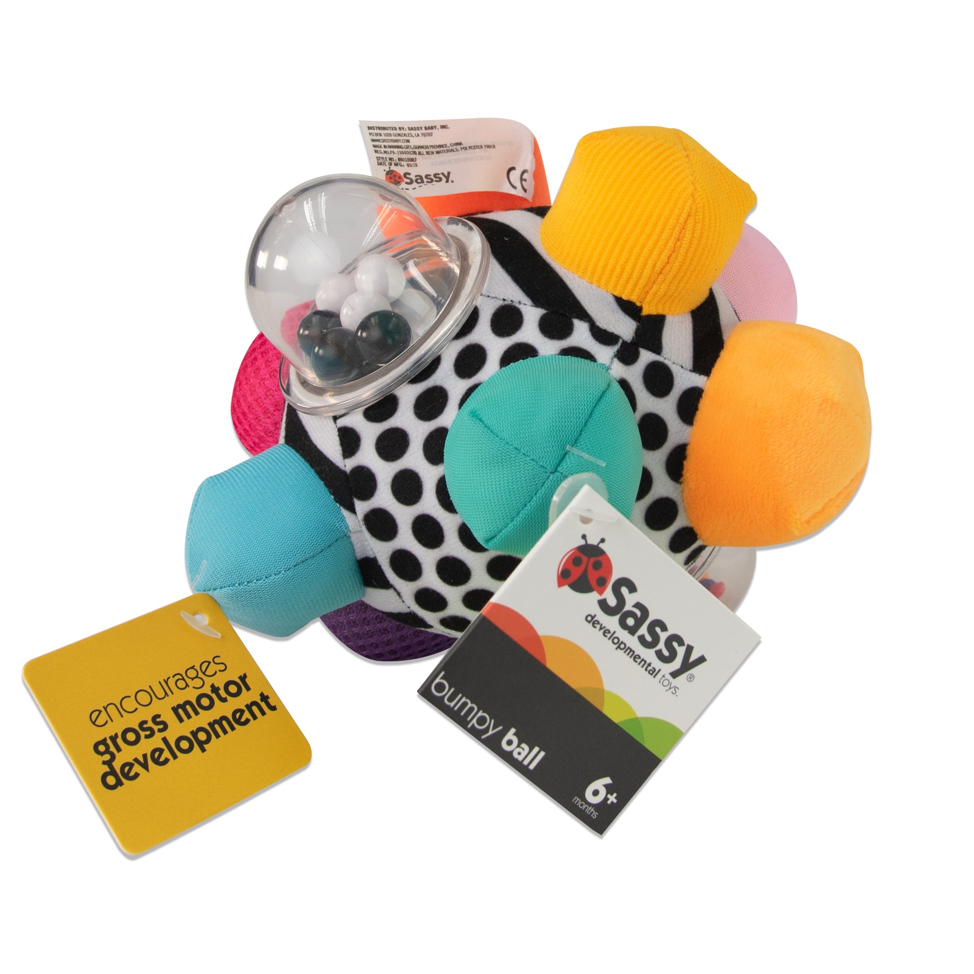 Chunky sized bumps encourage reaching, grasping, and transferring from one hand to the other.