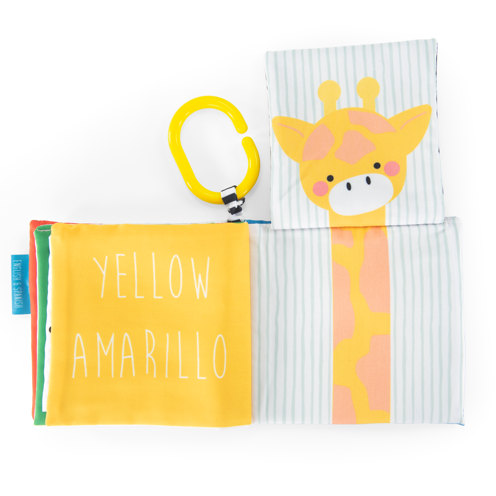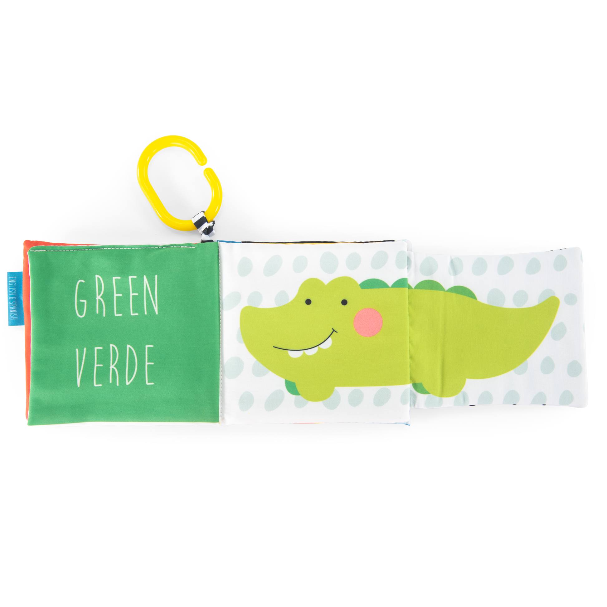 Help baby learn about her world with books showing patterns and creatures from everyday life. The bold black & white shapes throughout the book capture baby’s attention and help connect objects with words. Baby strengthens her hand-eye coordination by lifting the peek-a-boo flaps. Additionally, the crinkle-filled pages provide auditory stimulation. Attachable link allows for on-the-go fun!
