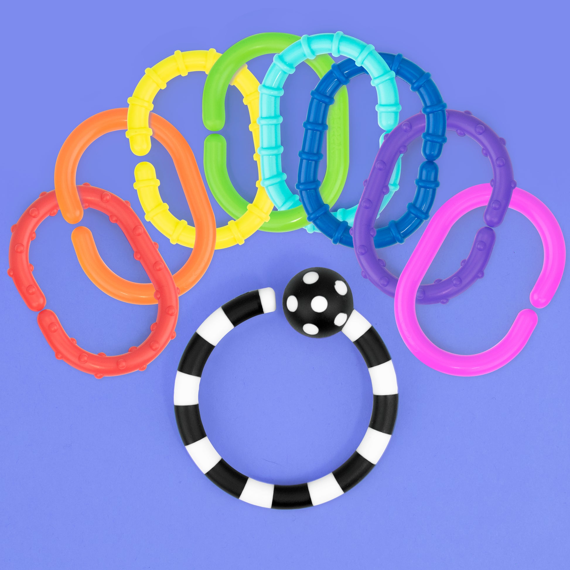 Provide visual stimulation and inspire touch with these brightly colored and multi-textured links.