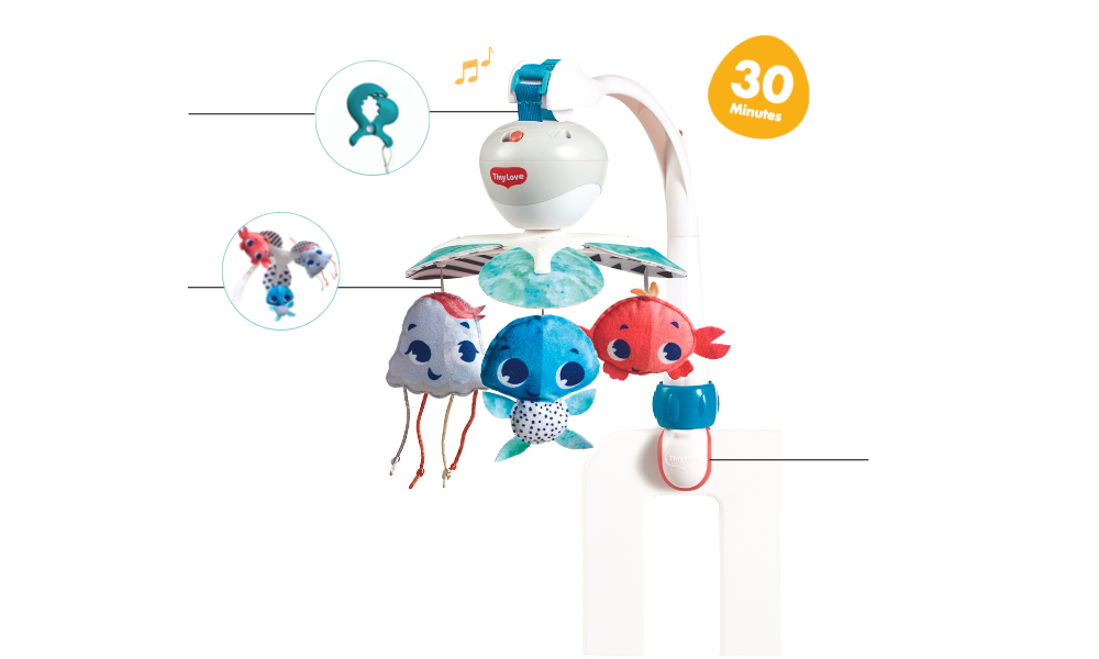 This take along mobile is perfect for soothing and engaging little ones both indoors and on the go. It offers 30 minutes of continuous music with 5 delightful melodies, providing a soothing variety of audio stimulation that keeps babies entertained.