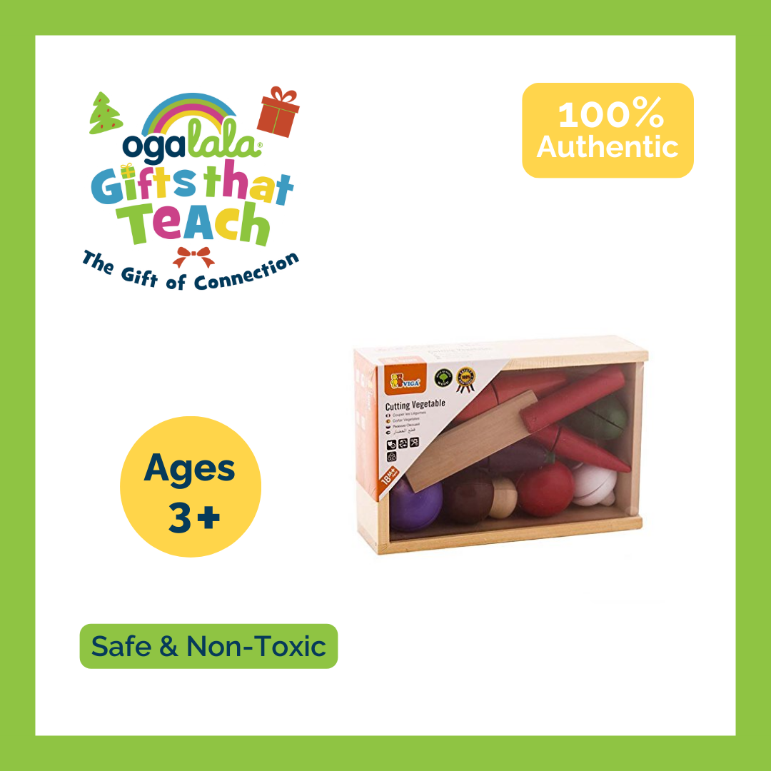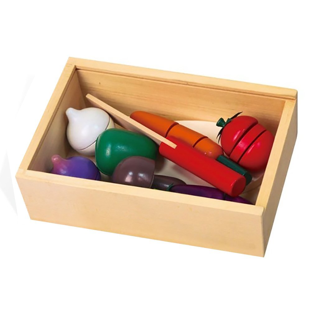 Viga Toys' Vegetable Cutting Set brings timeless pretend play fun. Well-finished with wooden vegetables, a cutting board and knive in a wooden box with an acrylic sliding lid.