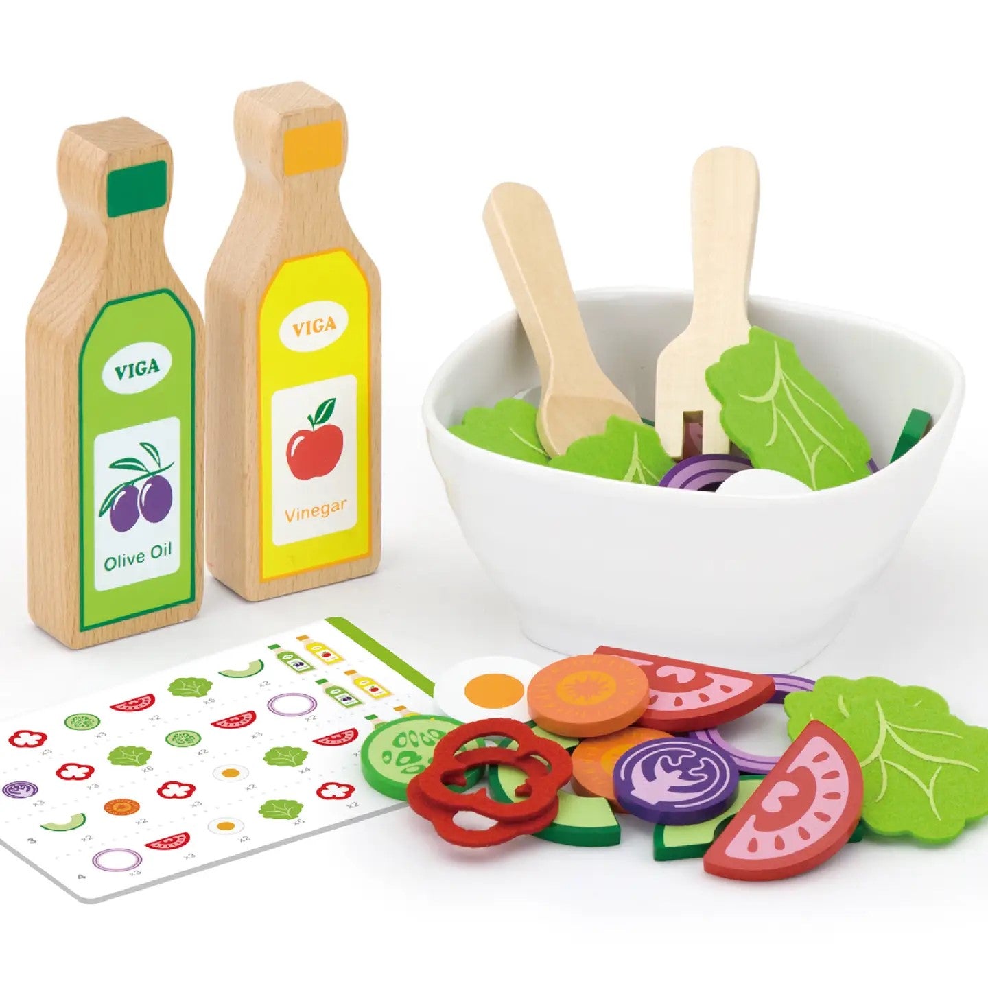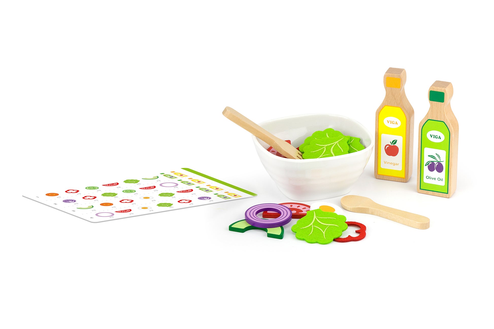 The all inclusive 36-piece set includes felt salad greens in a hinged container, wooden vegetables, tableware and a healthy salad recipe. For the finishing touch, two salad dressing bottles.