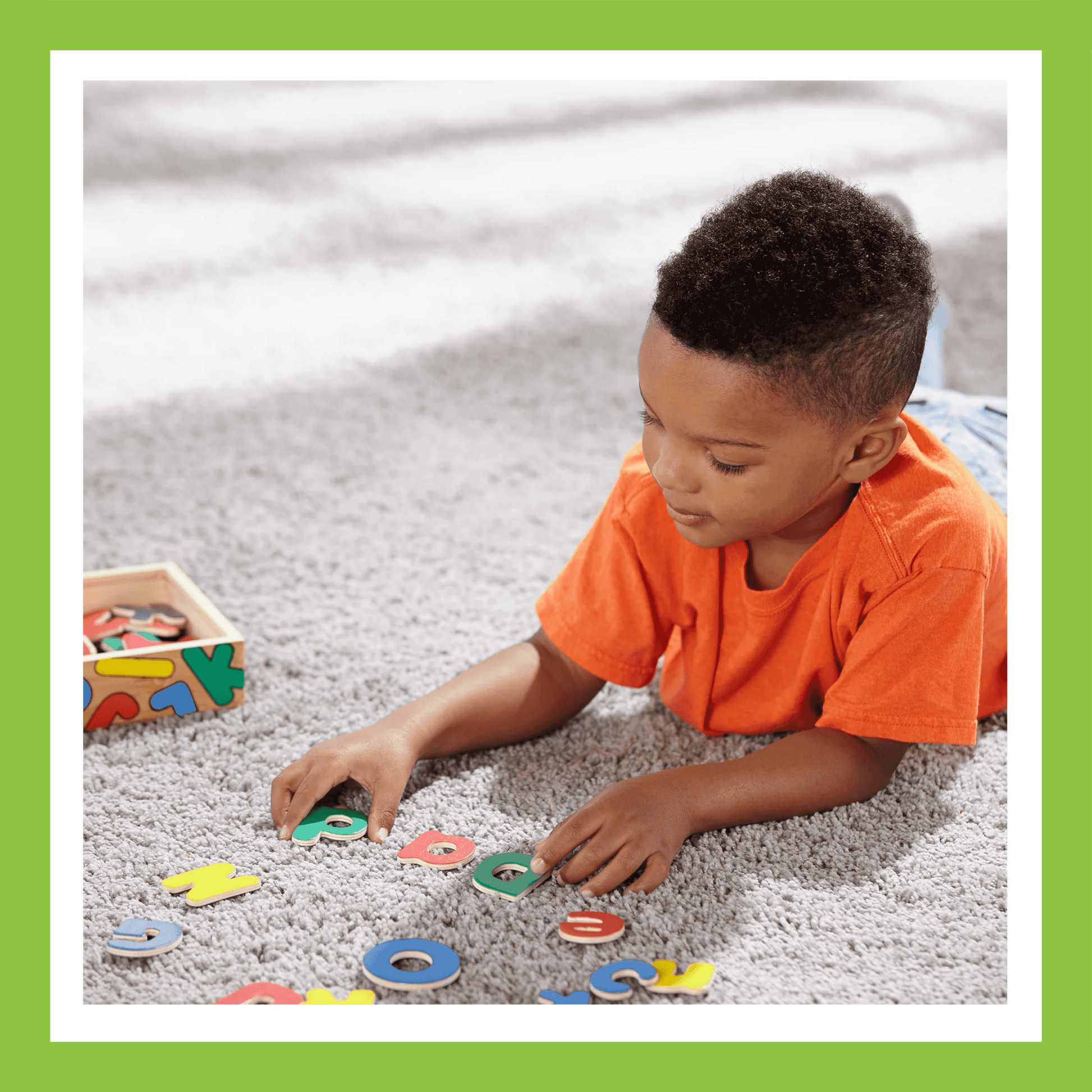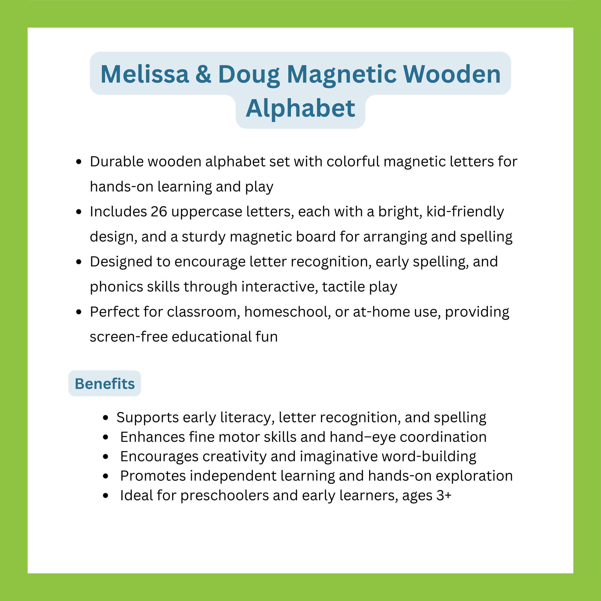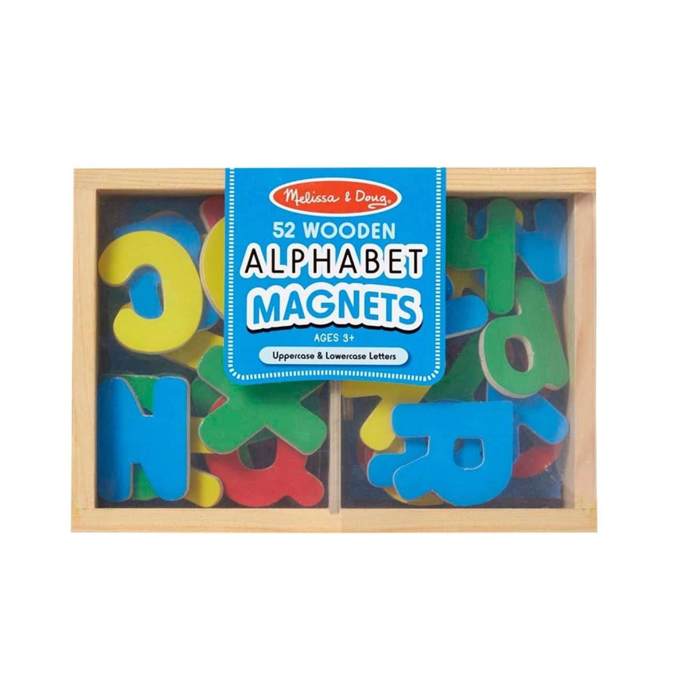 The set features 52 brightly colored magnetic letters in a handy wooden case for easy storage and on-the-go play.